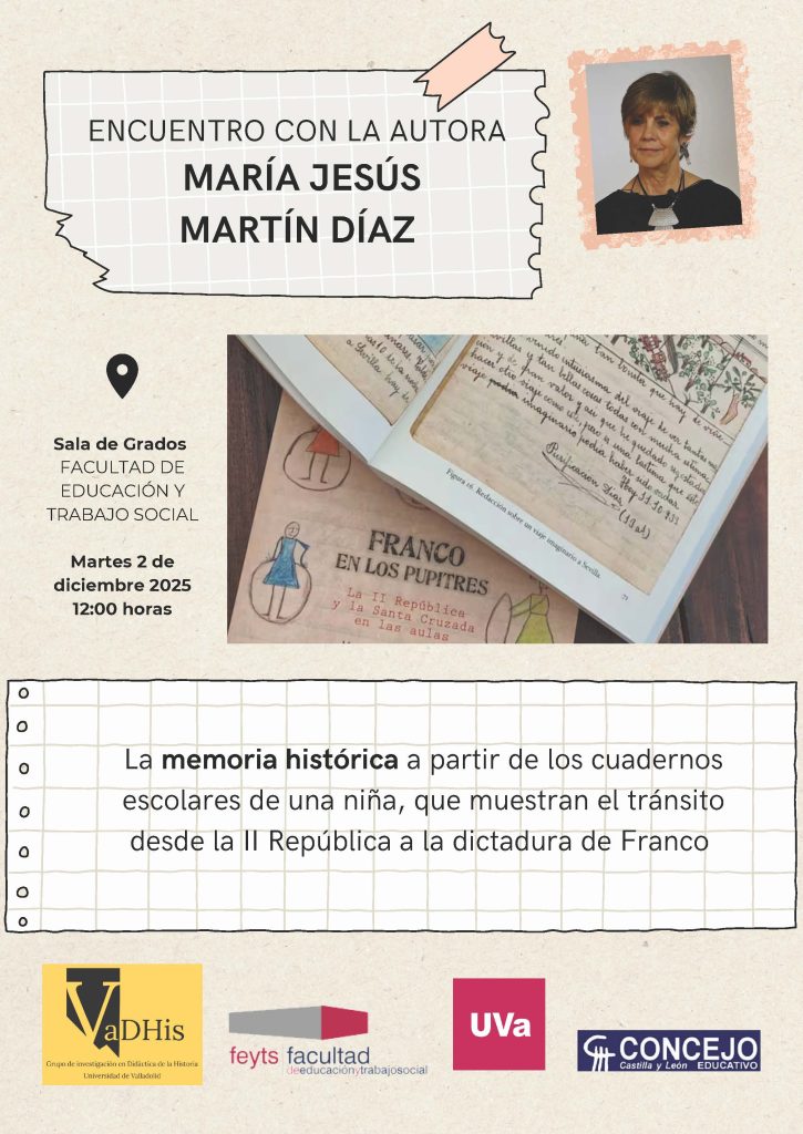 El próximo martes 2 de diciembre a las 12:00 h., la Sala de Grados de la Facultad de Educación y Trabajo Social de la Universidad de Valladolid acogerá el encuentro abierto al público con la autora Mª Jesús Martín Díaz, que presentará su libro “Franco en los pupitres”.